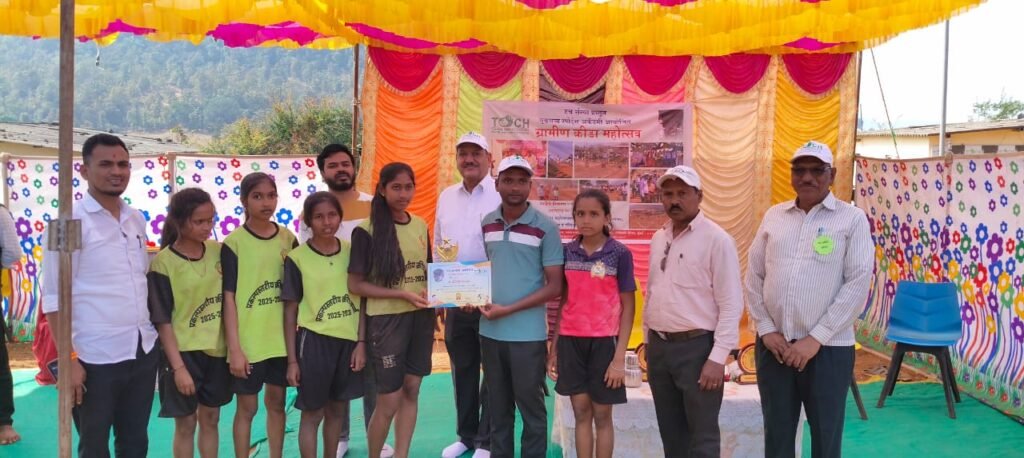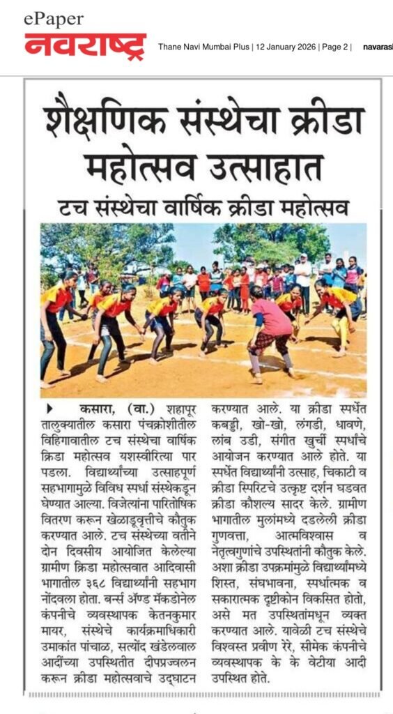 दिनांक १० जानेवारी २०२६ रोजी सर्व खेळांचे अंतिम सामने पार पडले. व पारितोषिक वितरण समारंभाप्रसंगी सिमॅक लिमीटेडचे जनरल मॅनेजर श्री. के.के. निवेटीया, टच संस्थेचे विश्वस्त श्री. प्रविण रेरे, संजय चौधरी, गावकरी प्रतिनिधी गणेश वाघ उपस्थित होते. टच ग्रामीण क्रीडा महोत्सव 2026 उत्साहात संपन्न! आज TOUCH – Turning Opportunities for Upliftment and Child Help आयोजित ग्रामीण क्रीडा महोत्सव अतिशय उत्साह, खेळभावना आणि शिस्तीच्या वातावरणात यशस्वीरीत्या संपन्न झाला. कबड्डी, खो-खो, लंगडी या संघ स्पर्धा तसेच धावणे, लांब उडी आणि संगीत खुर्ची या वैयक्तिक स्पर्धांमध्ये ग्रामीण व आदिवासी भागातील ३६८ विद्यार्थ्यांनी उत्स्फूर्त सहभाग घेतला.